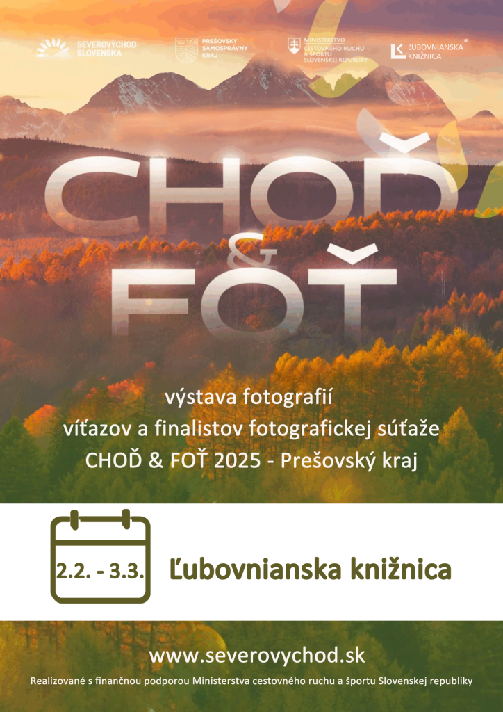 Ľubovnianska knižnica, kultúrna organizácia v zriaďovateľskej pôsobnosti Prešovského samosprávneho kraja, Vás pozýva na výstavu fotografií „CHOĎ A FOŤ“.