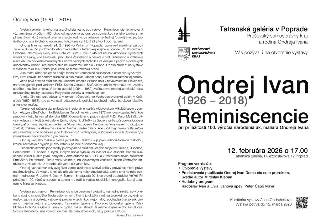 Tatranská galéria v Poprade, kultúrna inštitúcia v zriaďovateľskej pôsobnosti Prešovského samosprávneho kraja, Vás pozýva na vernisáž výstavy: „Ondrej Ivan (1926 – 2026) – Reminiscencia“, vo štvrtok 12. februára 2026 o 17:00 hod. v priestoroch Tatranskej galérie v Poprade na Hviezdoslavovej 12.