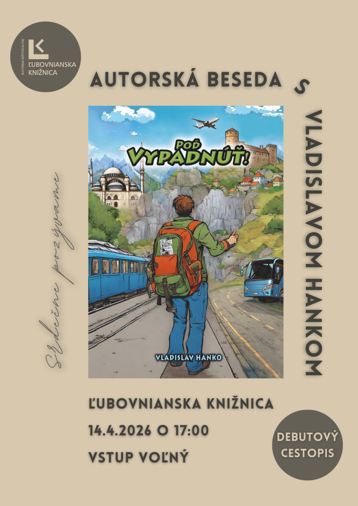 Ľubovnianska knižnica Vás dňa 14. apríla 2026 pozýva na dobrodružnú cestu s autorom autentického a pútavého cestopisu Poď Vypadnúť! Vladislav Hanko Vám na besede priblíži svet bez príkras – so všetkými vtipnými situáciami, nečakanými výzvami i dychberúcimi momentmi, ktoré zažil na vlastnej koži. S týmto originálnym cestovateľom zistíte, ako vystúpiť z komfortnej zóny, zbaliť si ruksak a vyraziť do sveta s obmedzeným rozpočtom a bez veľkých plánov. Príďte sa inšpirovať zaujímavými nápadmi na krátke výlety s praktickými radami, autorovými postrehmi a množstvom tipov, ktoré Vám do cestovania prinesú pocit slobody. Autor sľubuje, že táto kniha nebude zapadať prachom na polici, ale stane sa Vašim verným sprievodcom, a to nielen na miesta v nej spomenuté.