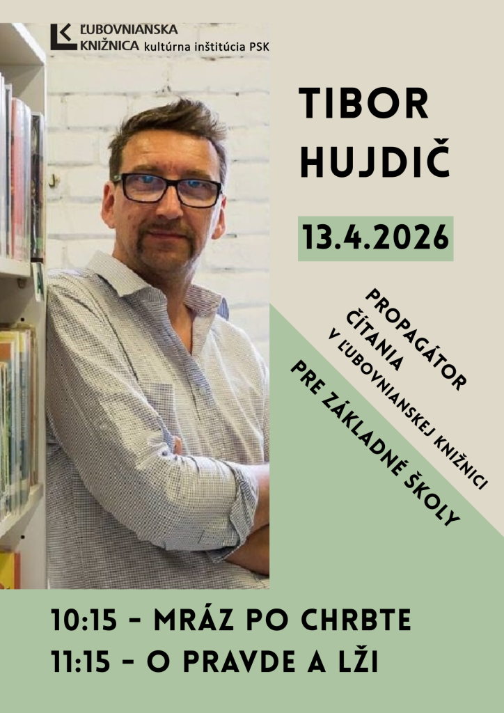 Ľubovnianska knižnica v Starej Ľubovni, kultúrna inštitúcia v zriaďovateľskej pôsobnosti Prešovského samosprávneho kraja, Vás pozýva na „STRETNUTIE S TIBOROM HUJDIČOM“, v pondelok 13. apríla 2026 o 10.15 a 11.15 hod. v priestoroch Ľubovnianskej knižnice na Letnej ul. č.6.