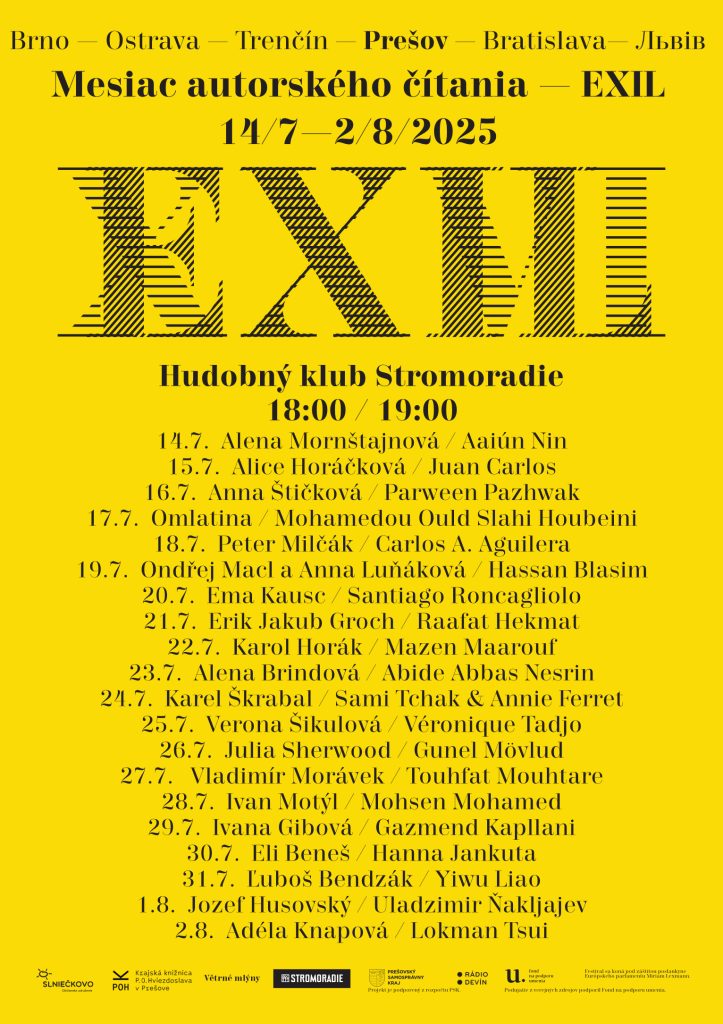 Vďaka téme exilu, ktorá spája hostí 26. ročníka festivalu, budú v hudobnom klube Stromoradie znieť okrem slovenčiny a češtiny aj angličtina, španielčina, perzština, arabčina, bieloruština, francúzština, turečtina, ruština i čínština. Medzi výrazné mená exilovej literatúry, ktoré sa predstavia na Mesiaci autorského čítania, patrí medzinárodne uznávaný Hassan Blasim, označovaný za najlepšieho žijúceho autora arabského románu. Jeho diela oslovujú široké publikum vážnymi spoločenskými témami. Tvorba africkej spisovateľky Wéronique Tadjo sa vyznačuje myšlienkami solidarity, historickej pamäte a traumy. „Výraznou hostkou exilového ročníka bude Alena Mornštajnová. Hoci pochádza z Čiech, jej tvorba má silný presah do slovenskej literatúry nielen vďaka predajnosti a čítanosti diel, ale najmä spracovaním historických a spoločenských tém,“priblížila riaditeľka knižnice P. O. Hviezdoslava v Prešove.