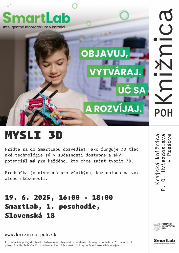 SmartLab v prešovskej knižnici má pritom naplánované aj ďalšie aktivity pre širokú verejnosť. Už vo štvrtok 19. júna to bude prednáška Mysli 3D, počas ktorej sa verejnosť dozvie, ako funguje 3D tlač a aké sú v tejto oblasti v súčasnosti dostupné technológie. O týždeň neskôr 26. júna na túto prednášku nadviaže podujatie Od nápadu k tlači. Účastníci počas neho predstavia svoje nápady, pod dohľadom odbornej asistencie lektora ich doladia a následne zrealizujú prostredníctvom 3D tlače.